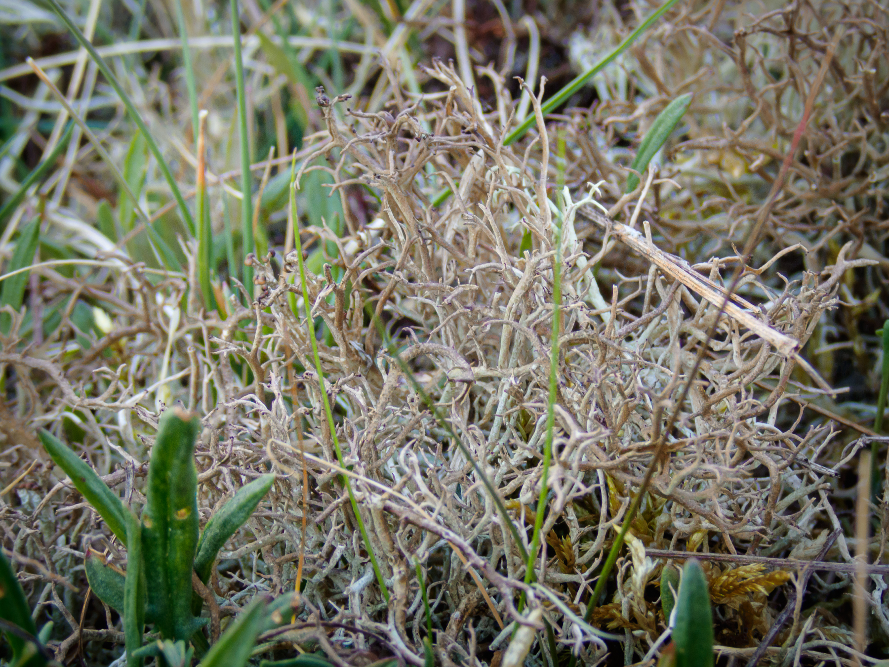 As its name suggests, C. furcata subsp. subrangiformis looks more like C. rangiformis than ‘ordinary’ C. furcata, and it more usually tests K+ yellow from atranorin. Yet it’s still quite distinct from C. rangiformis in form. It tends to be low, supine and worm-like, with a robust but creeping main stem from which branches diverge nearly at right angles. It also has a rougher cortex, often with small, burst spots on the main stem.