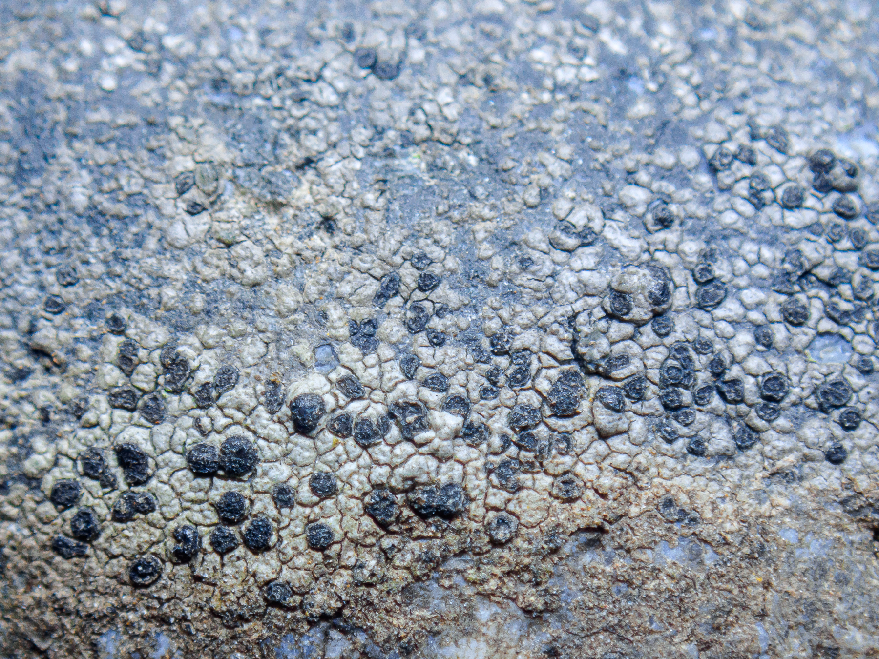 Rhizocarpon reductum is the most common and widespread Rhizocarpon species in Britain. You’ll find it more or less anywhere on suitable substrate, including for example on flint pebbles and sandstone gravestones as shown below. It’s sometimes subdivided into varieties based on form, which may one day be reassessed as subspecies or species in themselves: